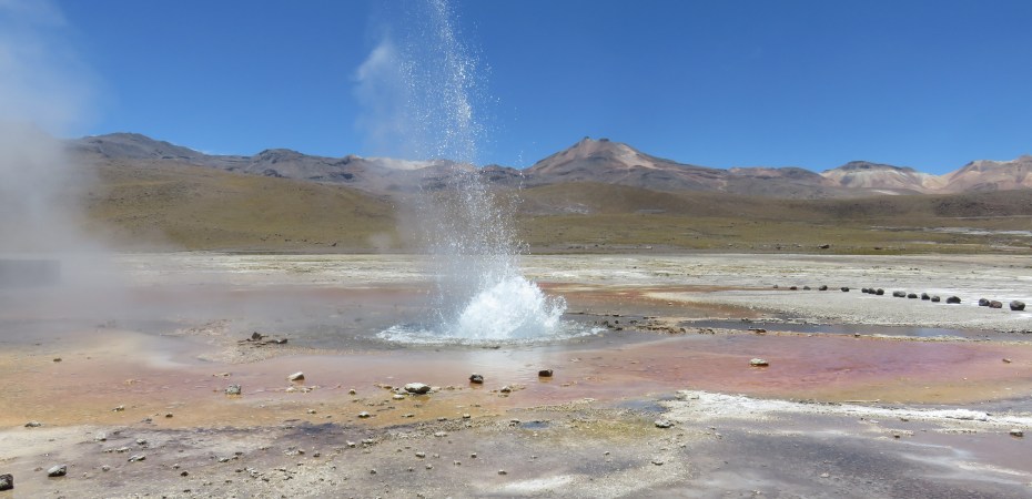 Arrivée aux geysers, à 4 300 m d’altitude. Ils ne jaillissent pas très haut en été mais peuvent atteindre 7-8 mètres de haut en hiver (nous sommes en été). Avec près de 80 geysers actifs, El Tatio est le plus grand site de geysers de l’hémisphère sud.
